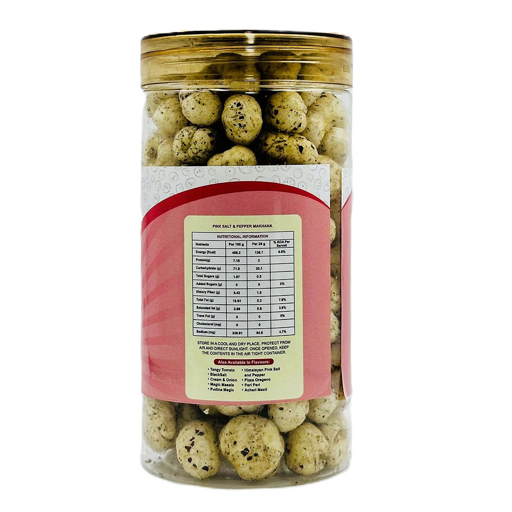 Himalayan Pink Salt and Pepper Makhana is a perfect gluten free snack infused with pink salt and pepper making it ideal during fasting. This high-fiber munch is surely a great source of guilt-free energy.