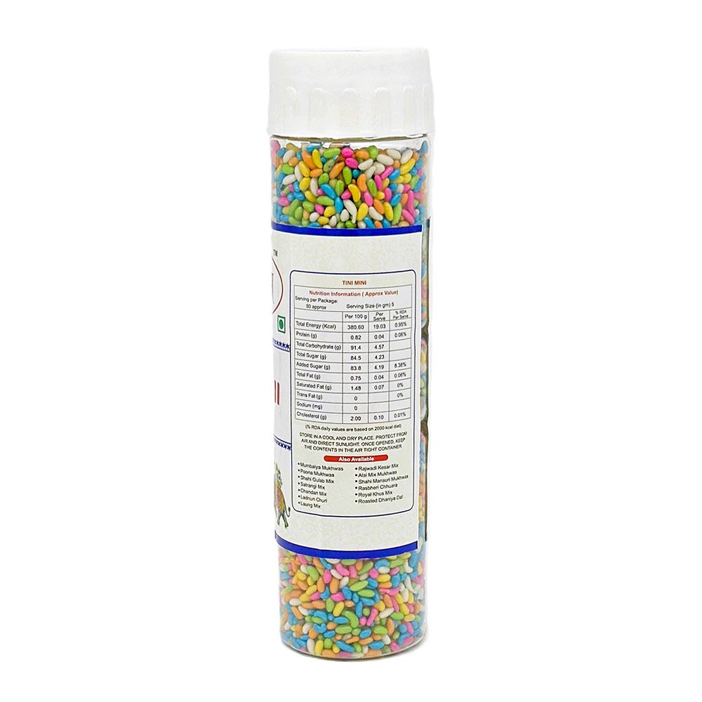 Tini Mini :- The colourful, sugar coated saunf not only serves as an after meal freshener but is also good for your digestion. Made from premium saunf, this after-meal freshener is apt for anytime indulgence.